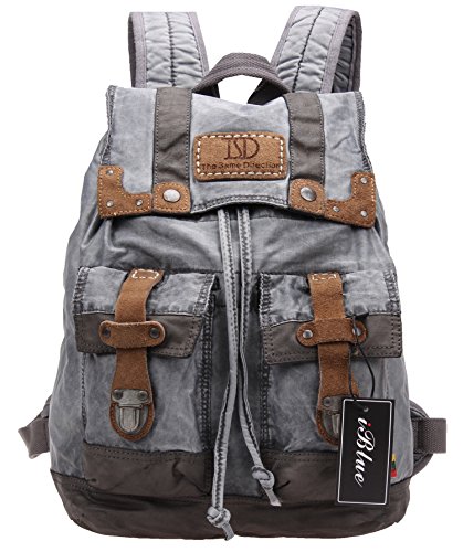 Iblue 16 Inch College Students Backpack Casual Canvas Leather Camping Bag #12 (grey black)