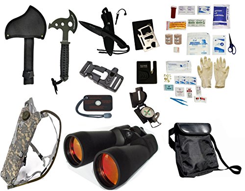 Survival Camping Hiking Kit: Emergency First Aid, 20X70 Binoculars Ruby,Sharpener, Axe, Fire Blade, Whistle Flint Striker Belt Buckle, ACU Hydration Backpack, Multi Tool, Compass, Signal Mirror